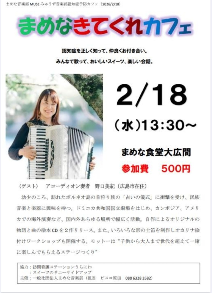 | 内容 | 認知症を正しく知って仲良くお付き合いする コミュニティーでのコンサートです。 |