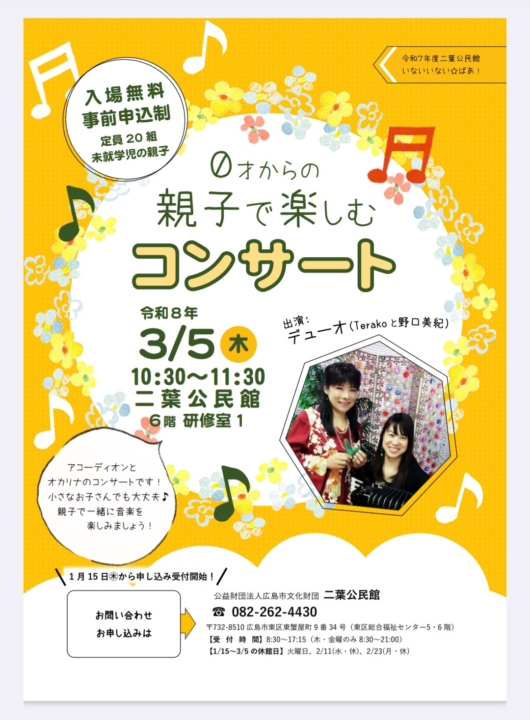 | 内容 | 演奏:デューオ(野口美紀&Tarako) 音楽を聴いたり、パーカッションでリズムをとったり親子で 楽しめるコンサートです。 申し込みは二葉公民館へ。082-262-4430 |